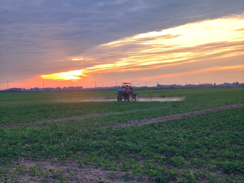 7月7日,在潘村湖农场公司第三农业分公司统一经营田内,农机手驾驶植保机正在进行大豆化除施药作业。陈凯 摄