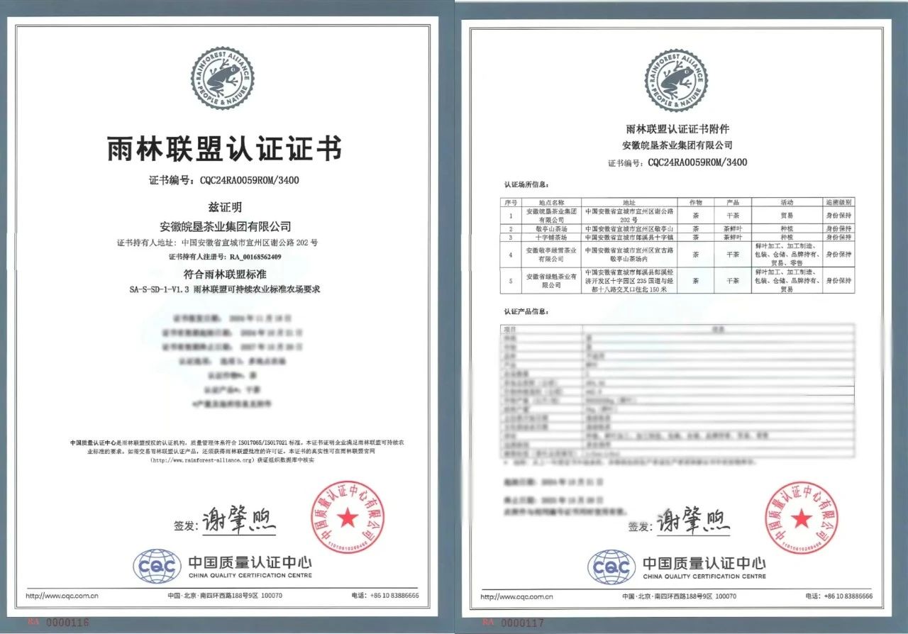2024年12月26日,中国质量认证中心、中国中检华东区域认证中心相关负责人专程赴皖垦茶业集团,为该企业颁发了雨林联盟国际认证证书。据悉,该企业是安徽省内首家持有该认证的国有企业,共有6639亩茶园和敬亭绿雪茶业公司、绿魁茶业公司两家茶叶加工企业顺利通过中国质量认证中心(CQC)雨林联盟国际认证。