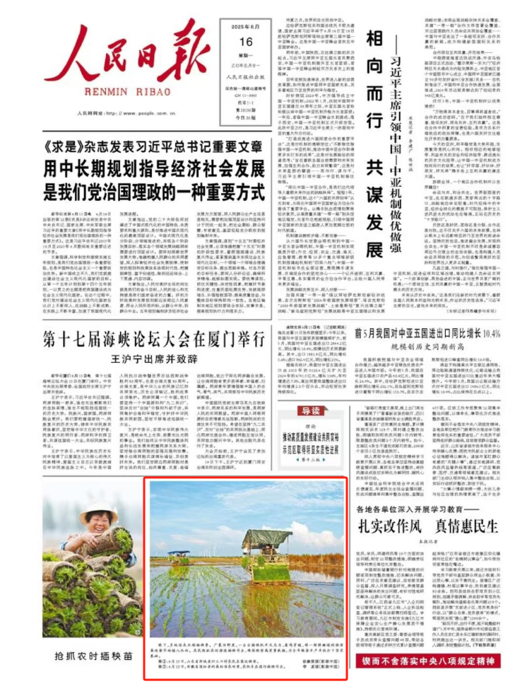 6月15日《人民网》首页和6月16日《人民日报》首版相继报道了安徽农垦华阳河农场夏种机插秧情况。